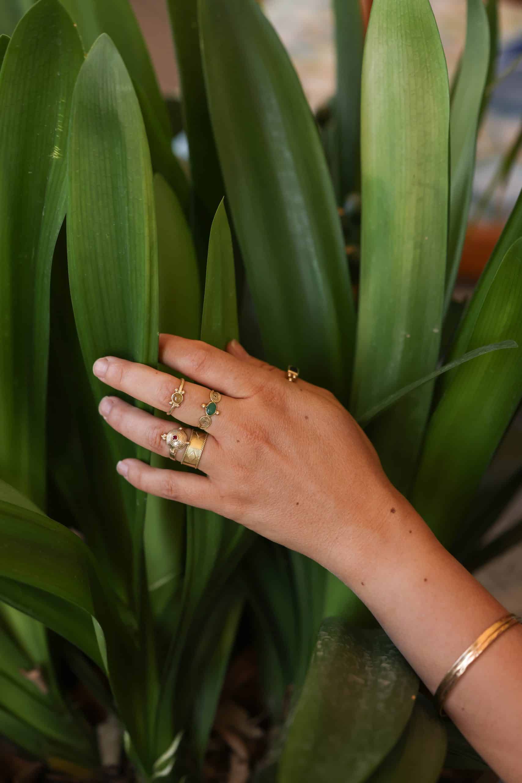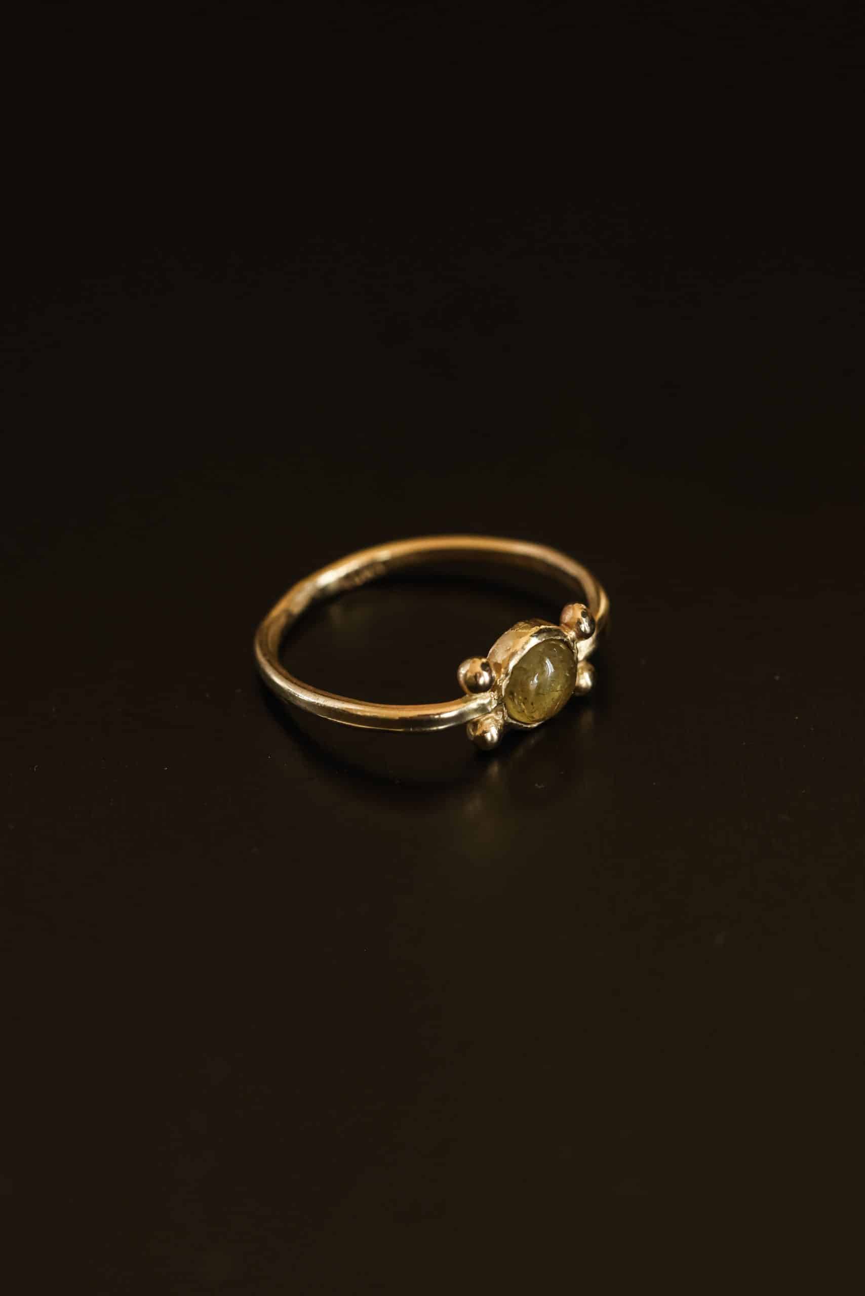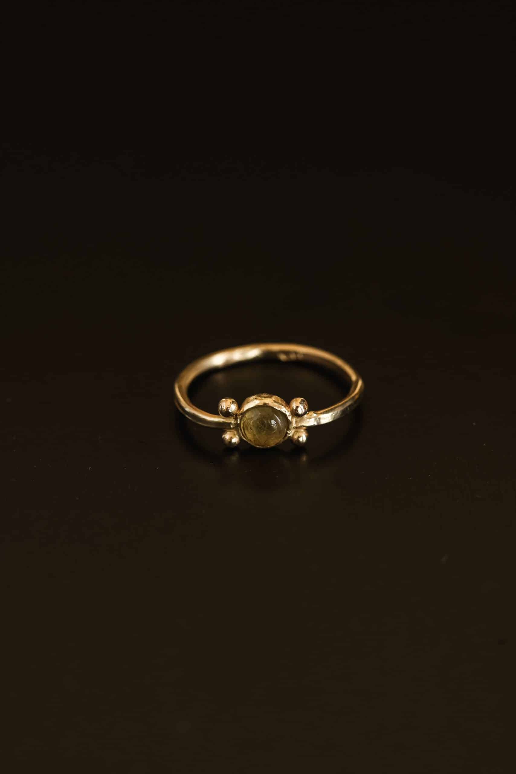 טבעת עדינה ומיוחדת בייסיקית עם נוכחות של אבן חן וארבעה כדורי זהב סביבו